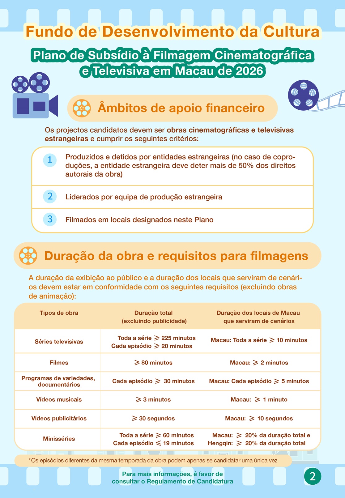 As obras cinematográficas e televisivas, tais como, séries televisivas, filmes, programas de variedades, documentários, vídeos musicais e vídeos publicitários, que tenham sido filmadas em Macau e que cumpram as seguintes durações, excluindo as obras de animação e podendo apenas se candidatar uma única vez os episódios diferentes da mesma temporada da obra:
