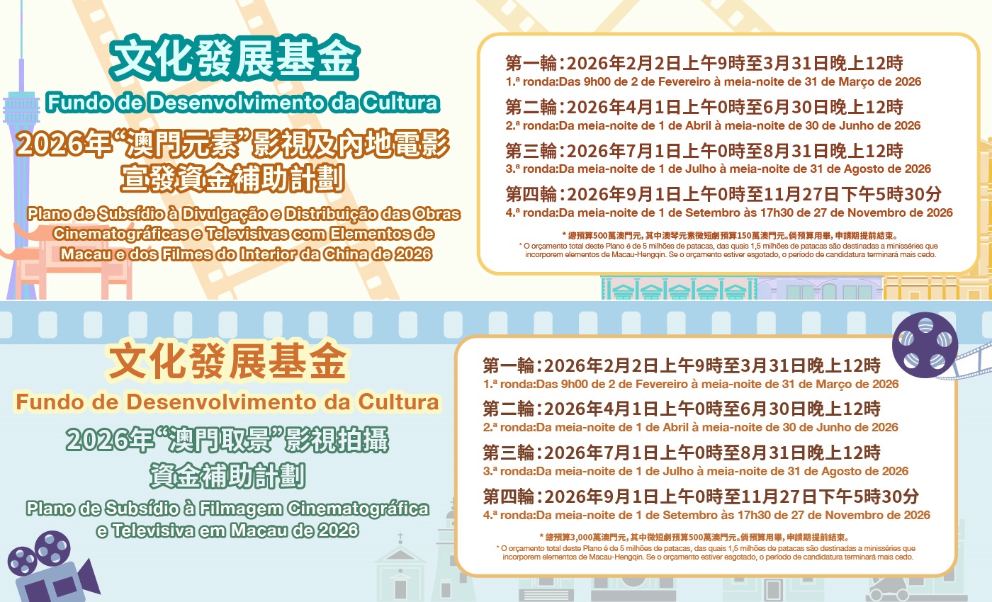 文化发展基金于2026年持续推动澳门影视产业,优化“澳门元素”及“澳门取景”两项资金补助计划,进一步鼓励具澳门及横琴粤澳深度合作区元素的微短剧拍摄与宣传发行,同时支持内地电影以澳门作为葡语系国家和地区的发行基地,发挥澳门作为文化交流桥樑的作用。