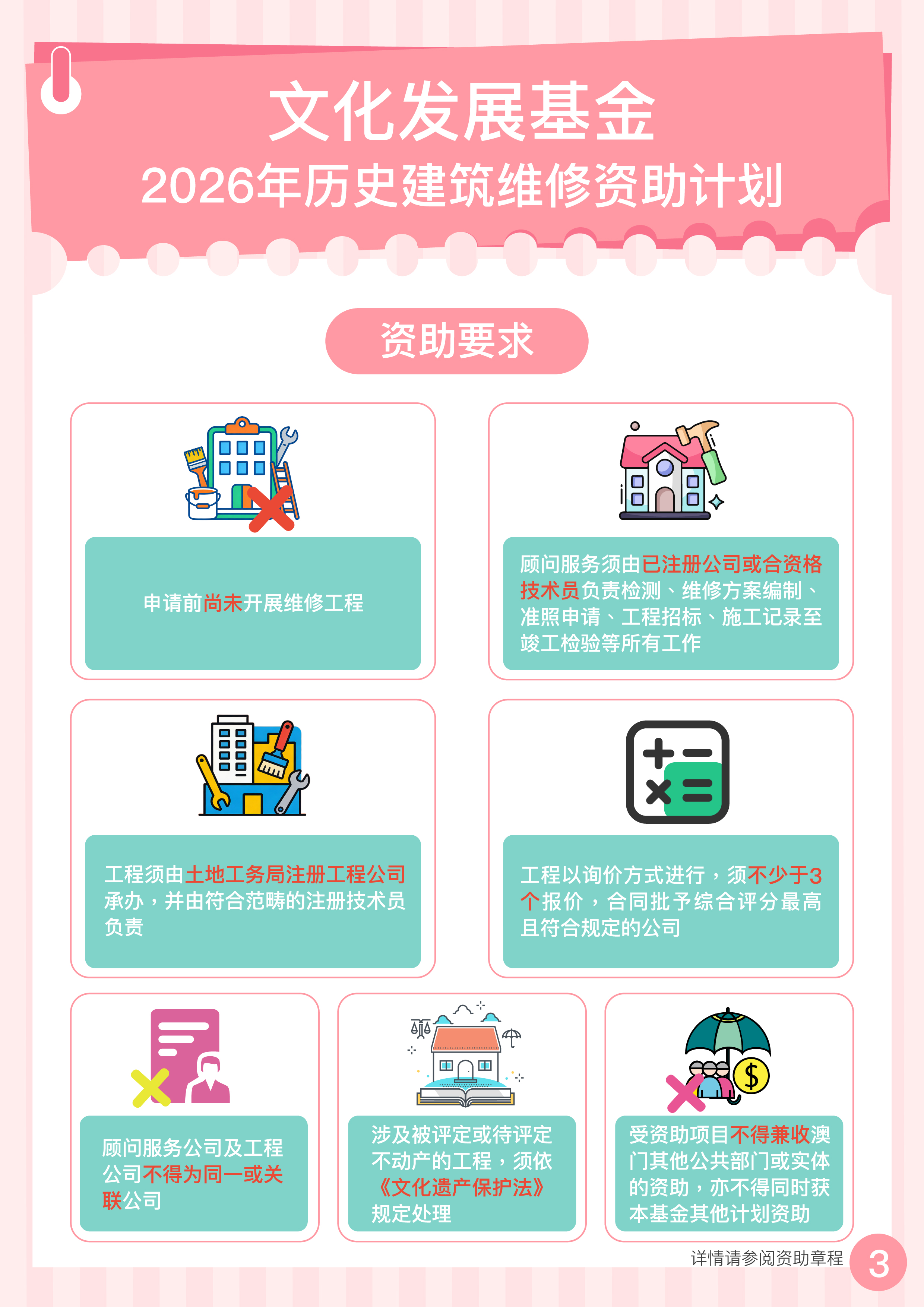 申请资格的限制:接受本资助之不动产,在第18.6.1点“竣工声明书”签署日起计两年内不可再就维修资助计划作出申请。 |