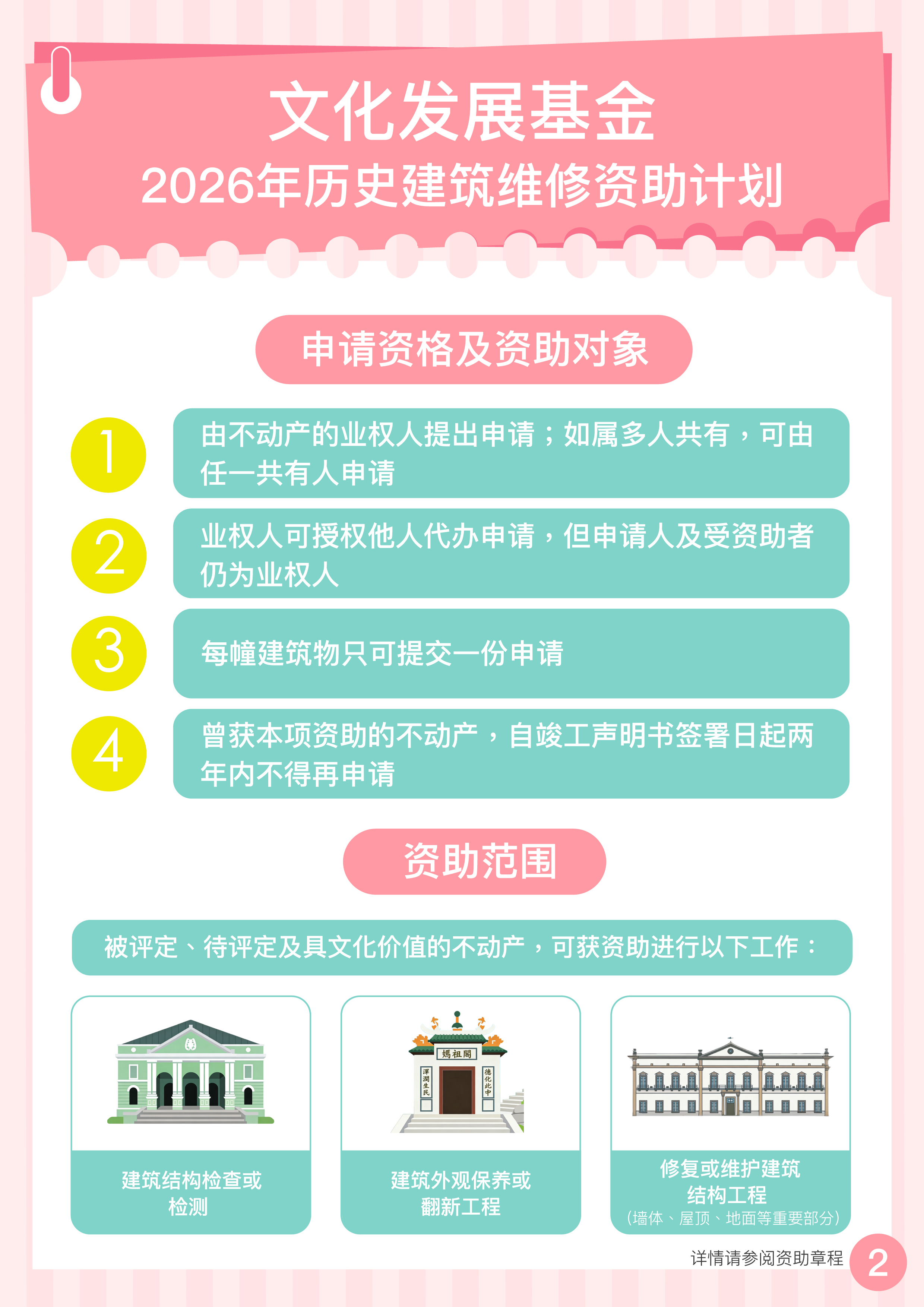 申请人须同意基金、文化局或委派之第三方授权的任何人士,由申请项目审批至总结报告获通过的期间,进入申请资助拟进行维修的建筑物,以实地考察建筑物现况。 | ||||||||||||||||||||||||||||||