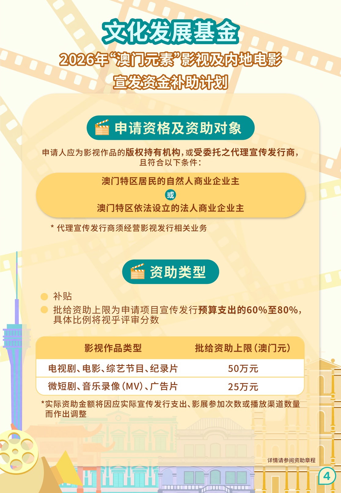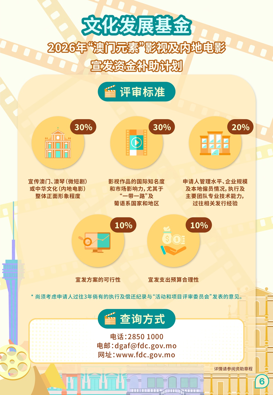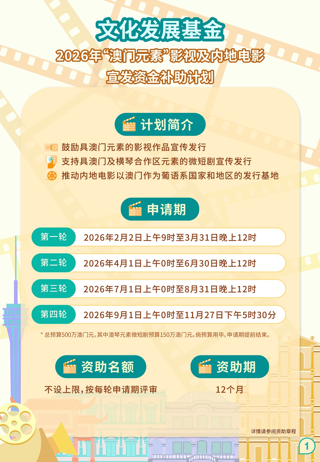 文化发展基金设立本项资助计划,鼓励具澳门元素的影视作品进行宣传及发行,资助范围涵盖具澳门及横琴粤澳深度合作区元素的微短剧,以配合“澳琴共建微短剧拍摄出海基地”的建设;同时鼓励内地电影以澳门作为葡语系国家和地区的发行基地,进一步发挥澳门的文化交流桥樑作用。 |