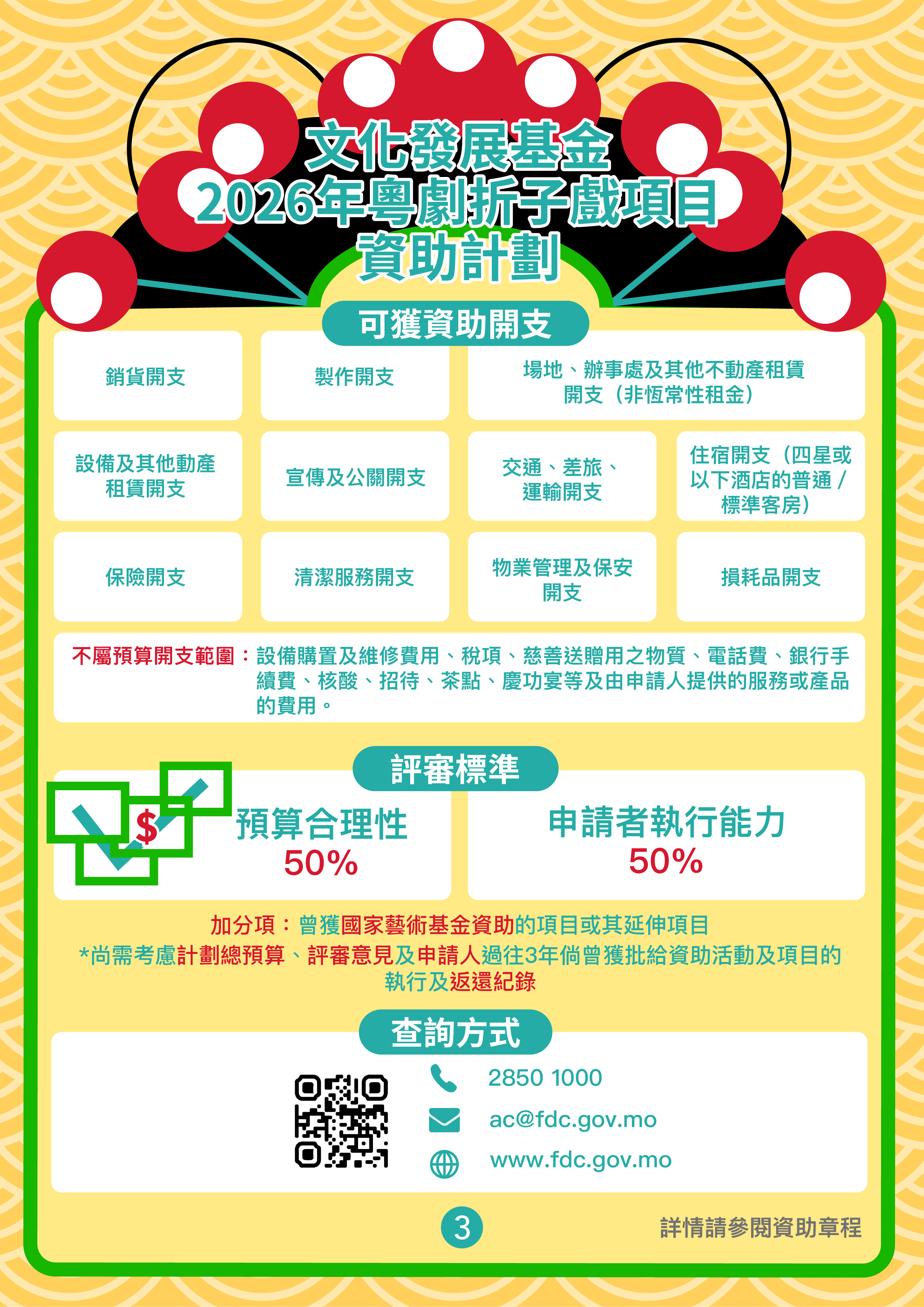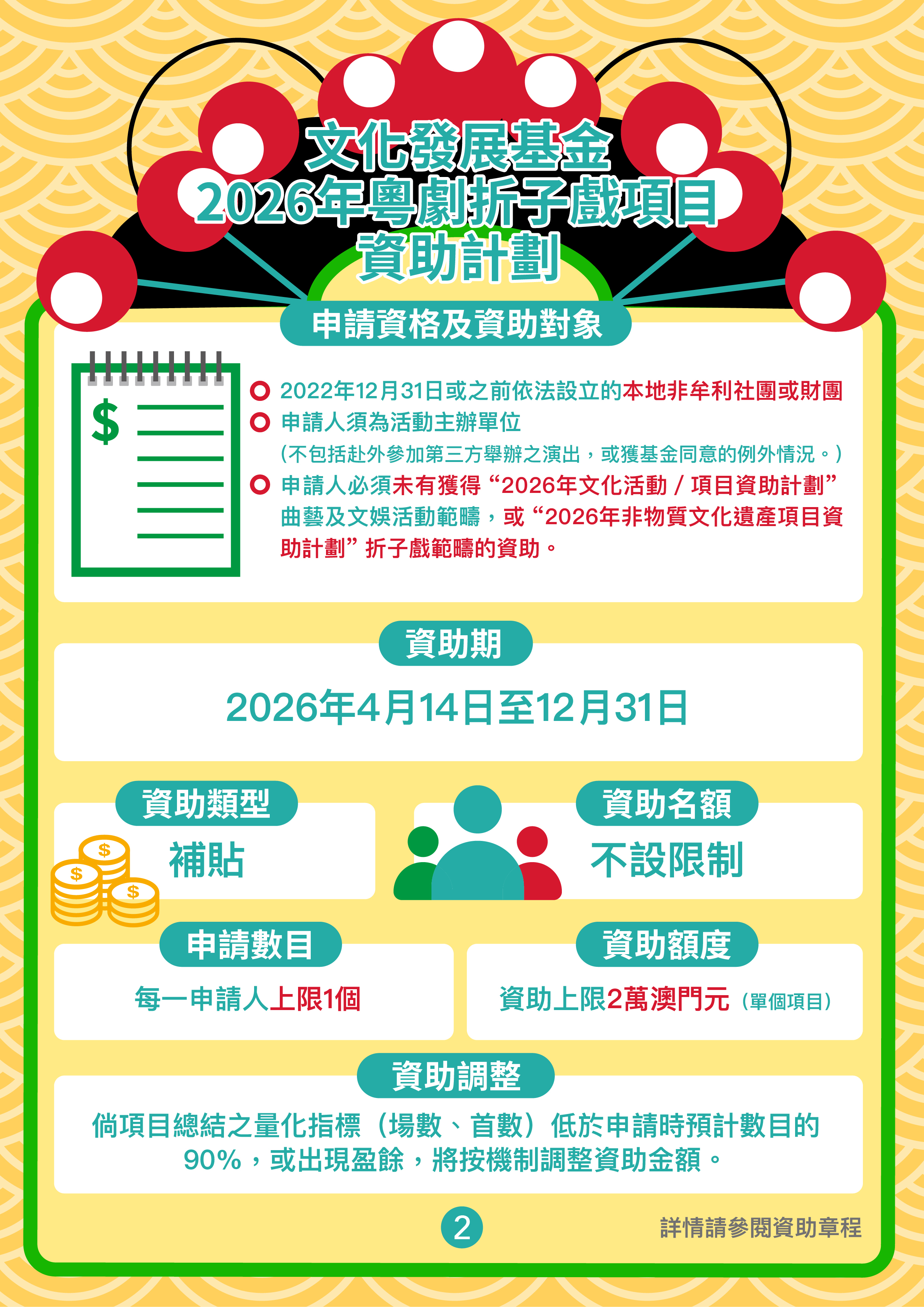 申請項目數目的限制:每一申請人可申請之項目數目上限為1個,且申請人並未獲得《2026年文化活動/項目資助計劃》的曲藝及文娛活動範疇、《2026年非物質文化遺產項目資助計劃》的折子戲範疇的資助。 |