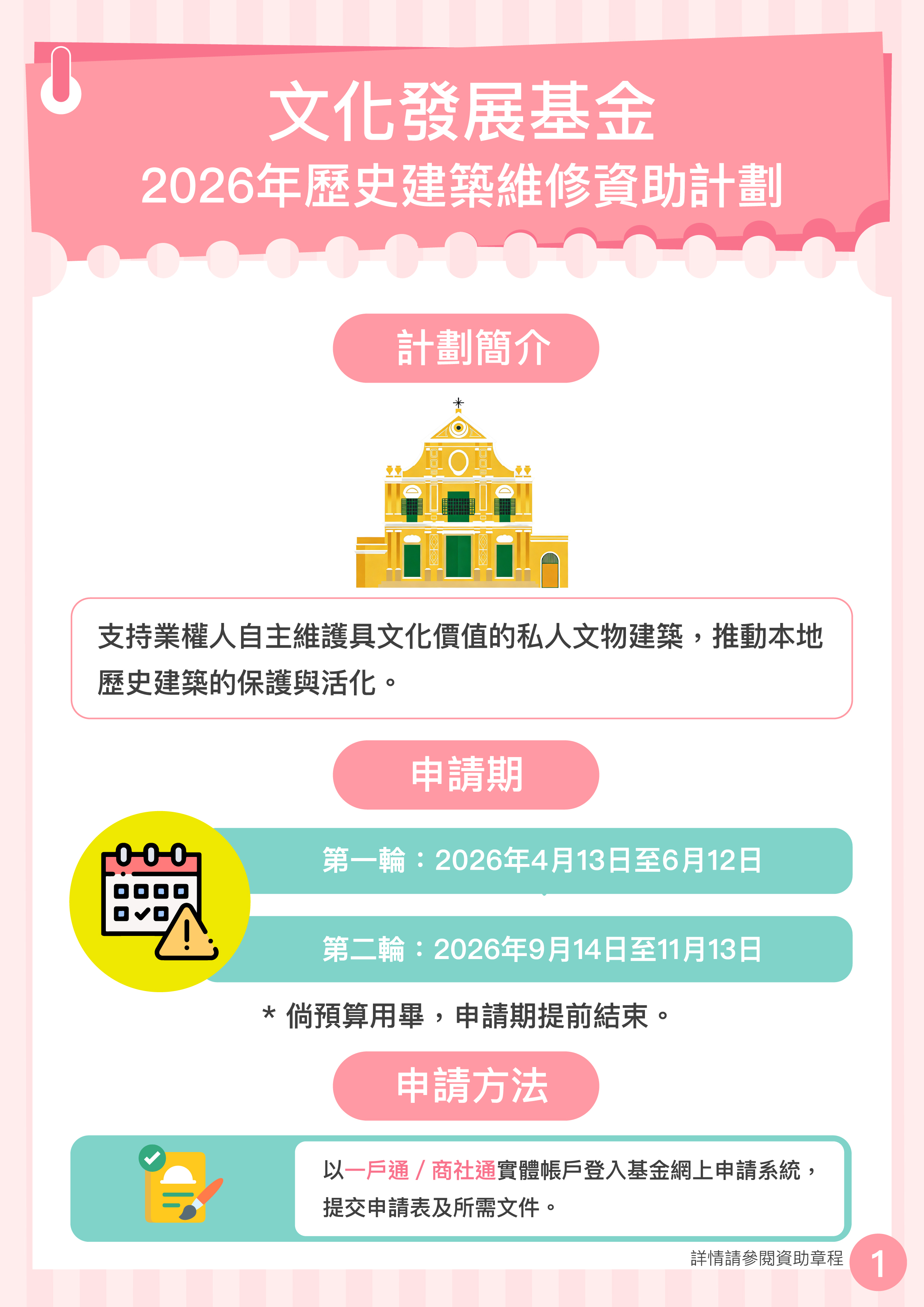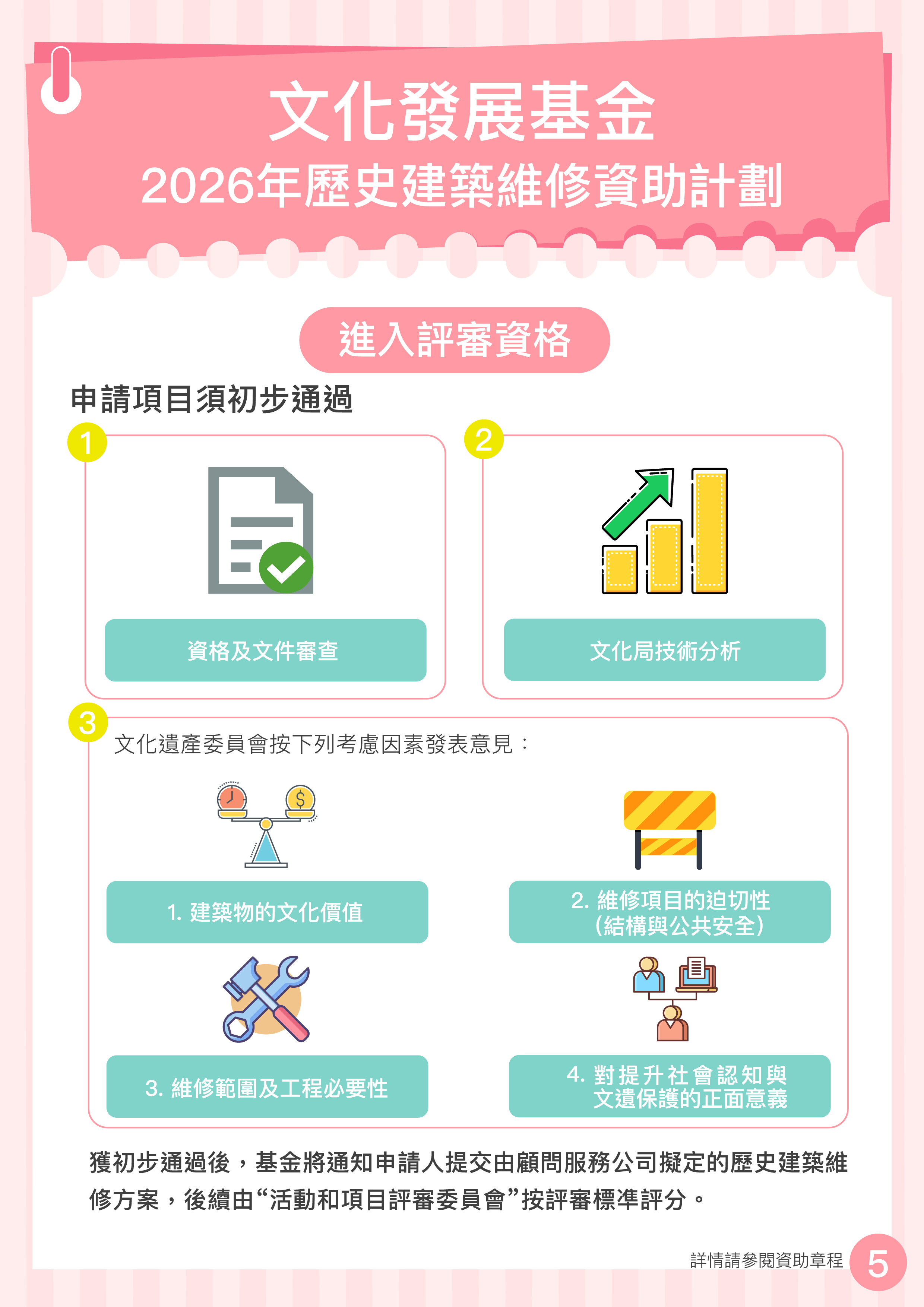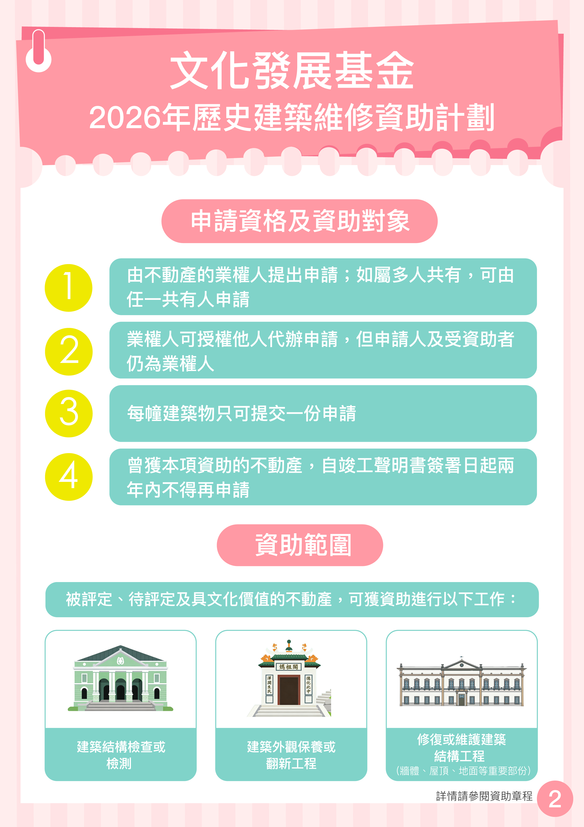 申請人須同意基金、文化局或委派之第三方授權的任何人士,由申請項目審批至總結報告獲通過的期間,進入申請資助擬進行維修的建築物,以實地考察建築物現況。 | ||||||||||||||||||||||||||||||