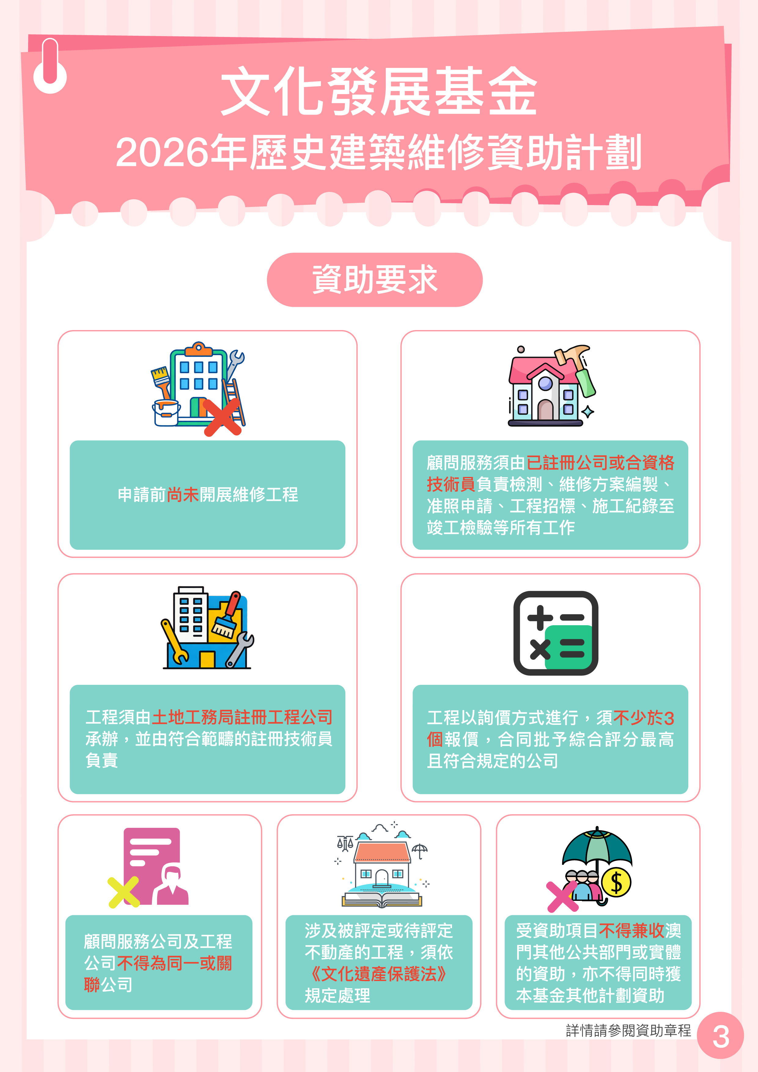 申請資格的限制:接受本資助之不動產,在第18.6.1點“竣工聲明書”簽署日起計兩年內不可再就維修資助計劃作出申請。 |