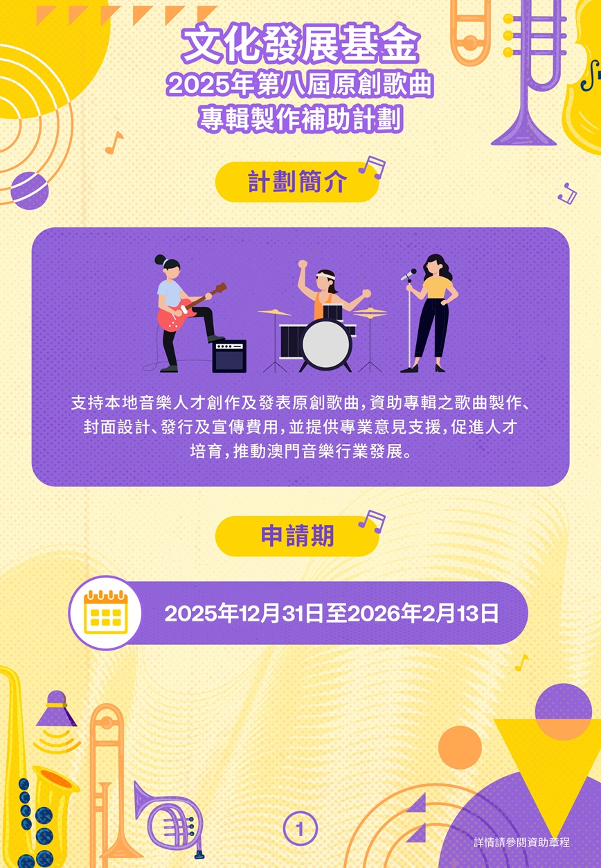 為培育更多本地音樂人才,推動本澳音樂行業發展,文化發展基金設立本計劃,旨在為本地音樂人才提供更多發表原創歌曲的機會,積累更多優秀作品,為開拓市場作好準備。 基金將向受資助者提供以下兩部分支援:一、資助:專輯之歌曲製作、封套設計、專輯發行及宣傳推廣費用;二、專業意見支援:專家將為受資助者提供專輯製作等相關專業意見,以完善其計劃。 |