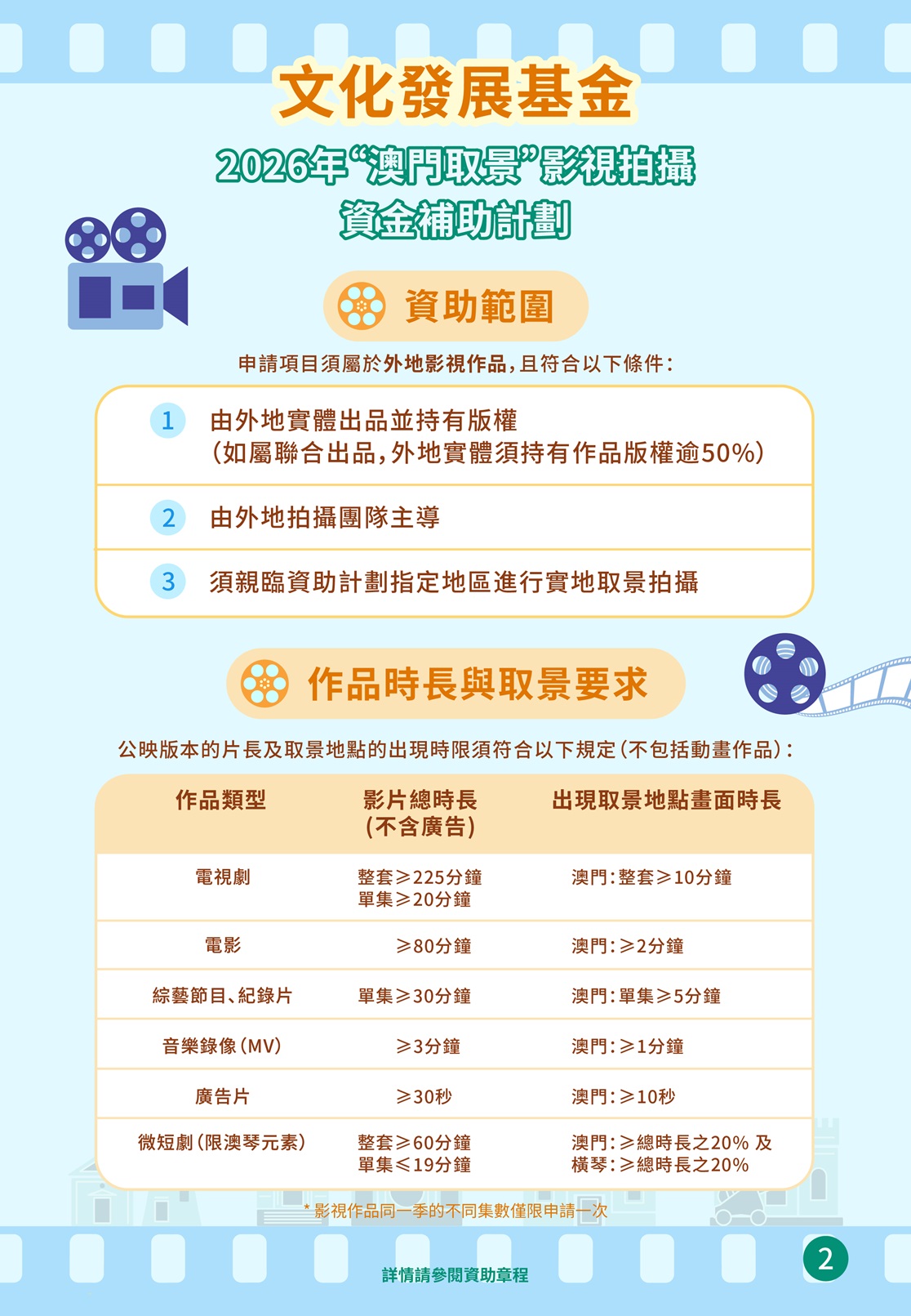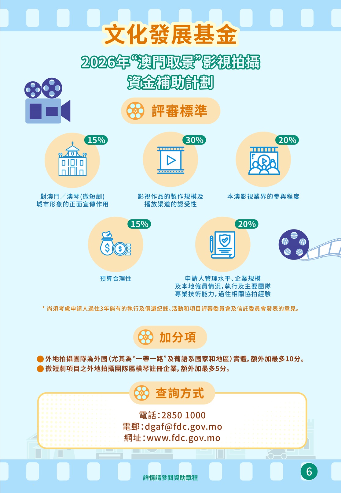 文化發展基金設立本資助計劃,鼓勵或吸引外地拍攝團隊到澳門實地取景拍攝,以加強推廣澳門正面形象,帶動文創與旅遊的聯動發展,並向本地影視從業人員創造工作機會,促進與外地團隊的技術交流和合作,助力提升本地影視製作的專業水平;資助範圍涵蓋在澳門及橫琴粵澳深度合作區進行微短劇實地取景拍攝的項目,以配合“澳琴共建微短劇拍攝出海基地”的建設。 |